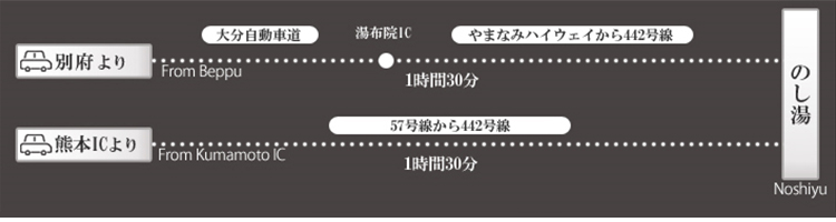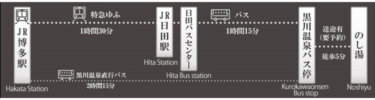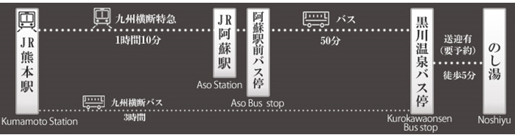 JR熊本駅より 九州横断特急■JR熊本駅 ⇒ 黒川温泉バス停 :約2時間